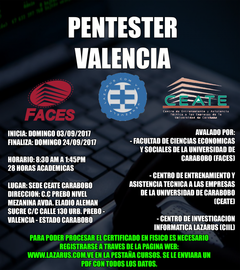 Para tener más información del curso es necesario registrarse a través de nuestra página web http://www.lazarus.com.ve/contacto/ , en las próximas 48 horas te enviaran PDF con detalles del mismo, nuestros cronogramas son trimestrales y se publican a traves de nuestra pagina web y redes sociales. Valoramos su interés para con nosotros. Gracias.